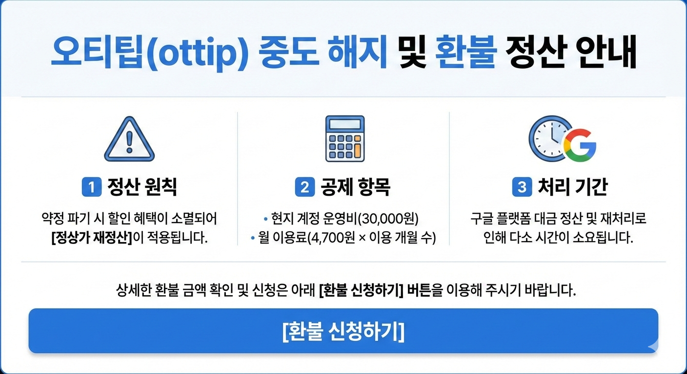 수식: 환불액 = [실제 결제 금액] - [30,000원] - [4,700원 × 이용 개월 수] (※ 이용 개월 수는 30일 단위를 기준으로 올림 처리됩니다.)